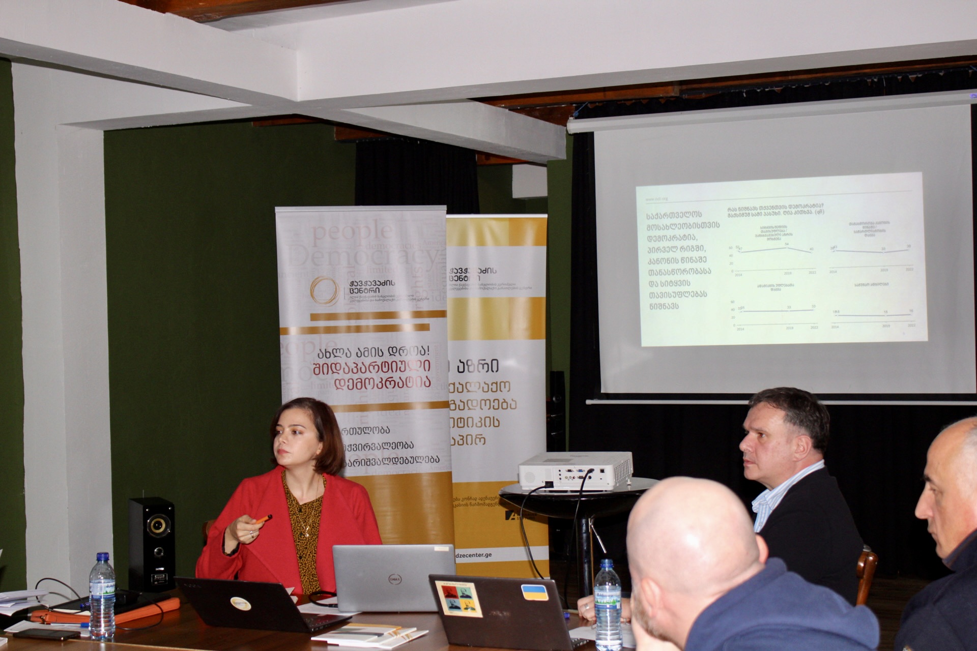 განხილულ იქნა ქართულ პოლიტიკურ პარტიებში შიდაპარტიული დემოკრატიის არსებული დეფიციტის მიზეზები, შედეგები და აღმოფხვრის გზები. მონაწილეებმა იმსჯელეს შესაძლო კორელაციაზე შიდაპარტიული დემოკრატიის ხარიხსხა და მოქალაქეთა მხრიდან პარტიების მიმართ არსებულ მზარდ გაუცხოებას შორის.