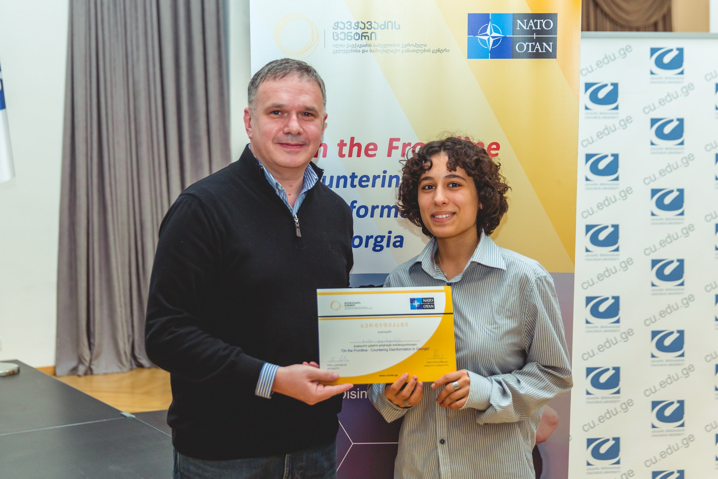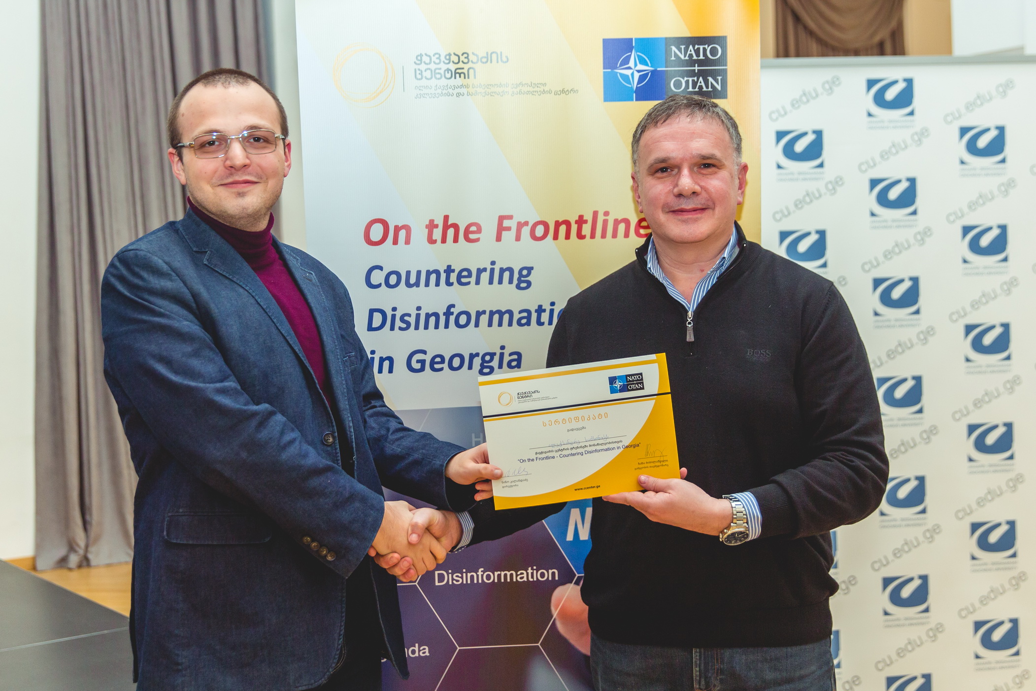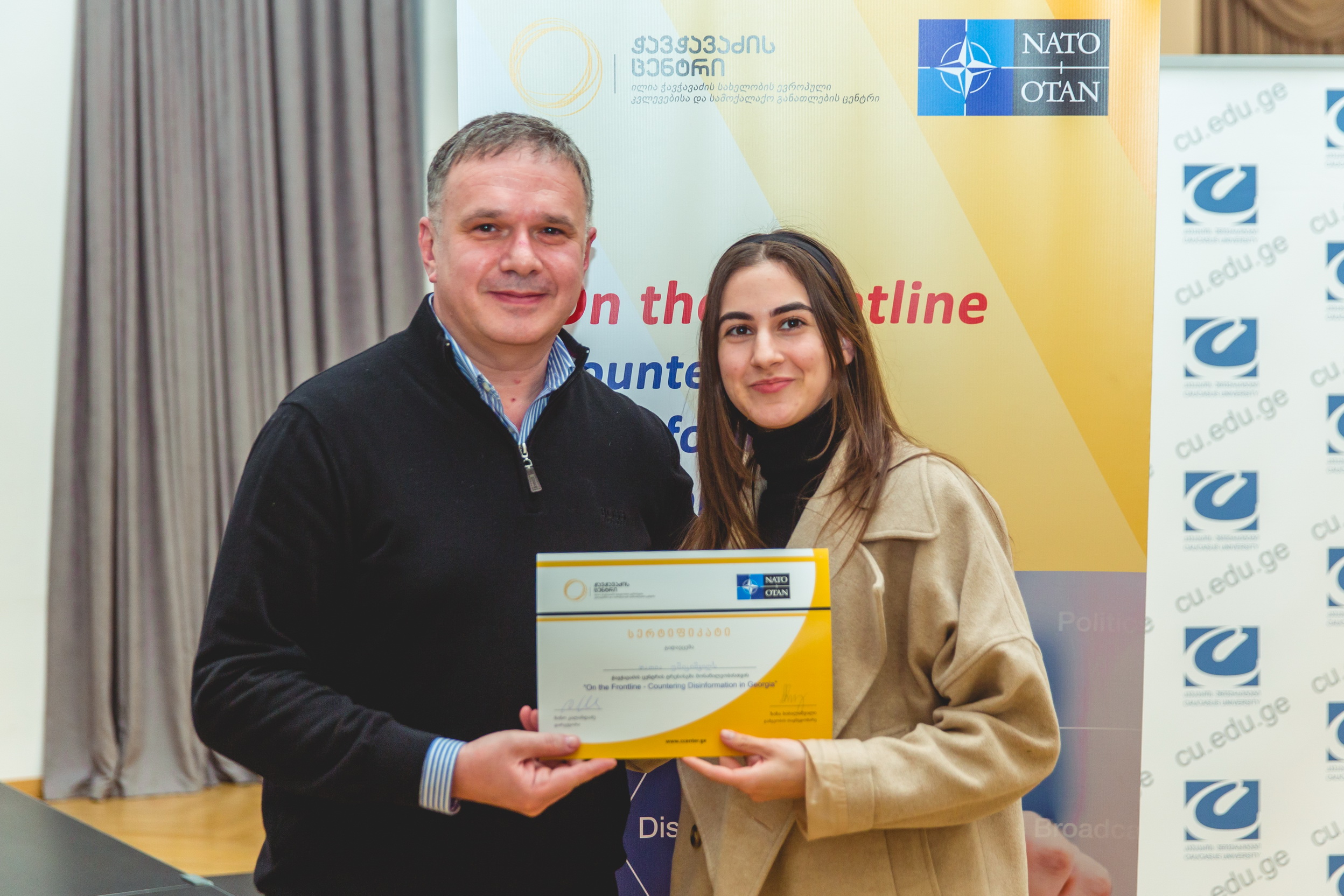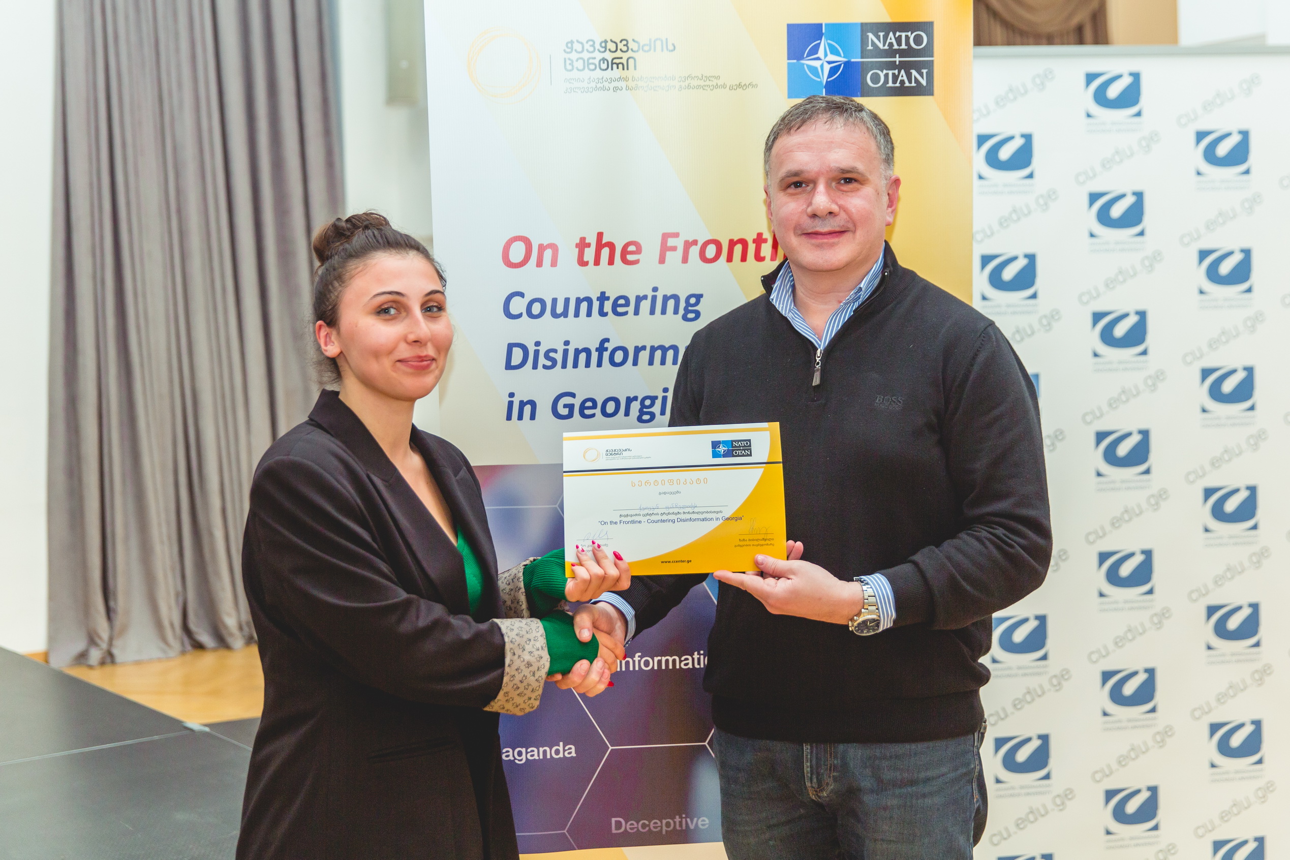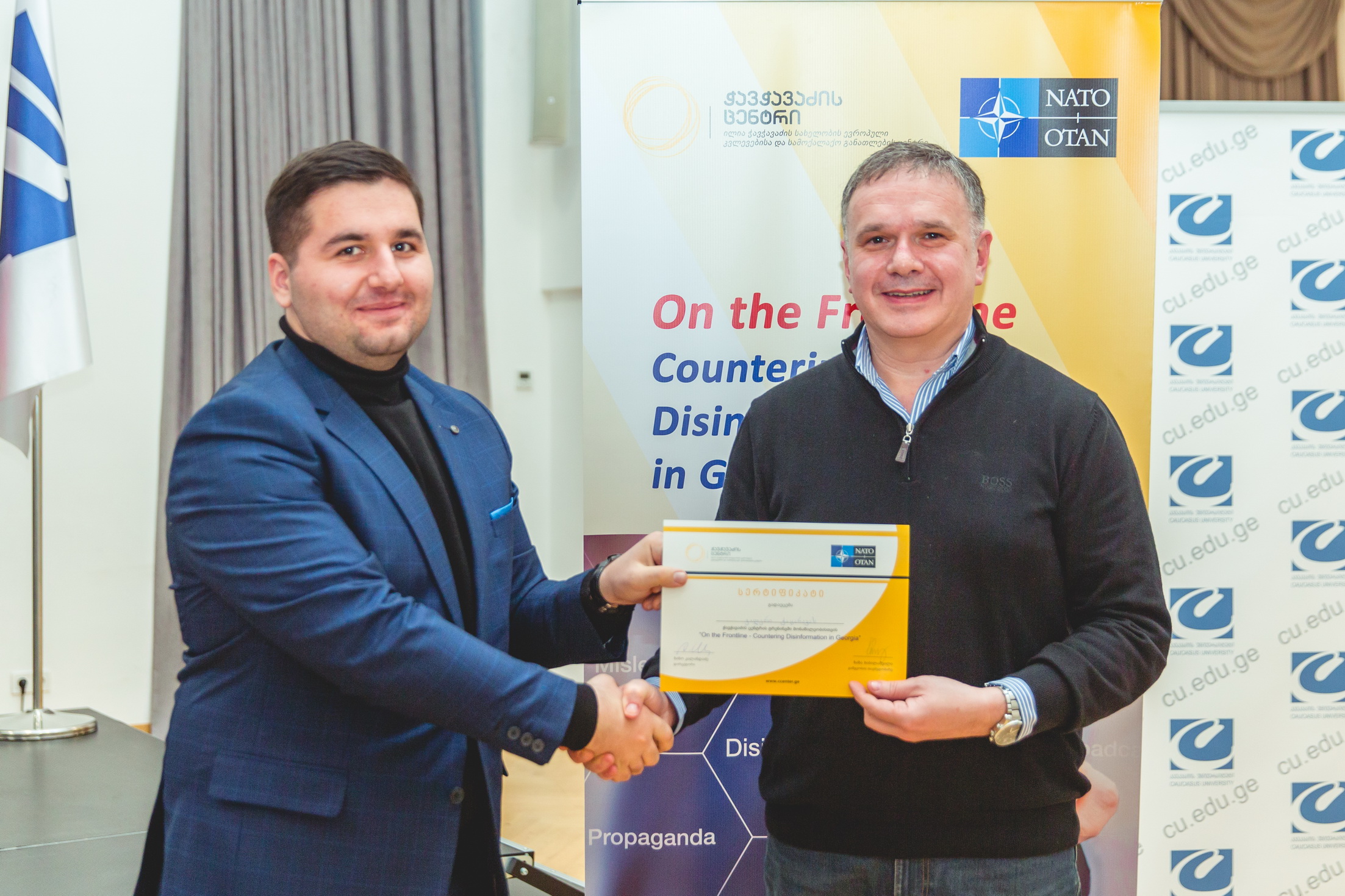 და NATO-ს სახალხო დიპლომატიის განყოფილების მხარდაჭერით, კავკასიის უნივერსიტეტი - Caucasus University-ში გაიმართა ჭავჭავაძის ცენტრის პროექტის „წინა ხაზზე - დავამარცხოთ დეზინფორმაცია საქართველოში“ შემაჯამებელი ღონისძიება. პროექტი სამ ეტაპად განხორციელდა და მასში სხვადასხვა ასაკის 80-მდე ადამიანმა მიიღო მონაწილეობა. ტრენინგებისას ცენტრის მკვლევარები და მოწვეული ექსპერტები მონაწილეებს ესაუბრნენ დეზინფორმაციის ამოცნობასა და მასთან ეფექტიანი ბრძოლის მეთოდებზე. მონაწილეებს გადაეცათ ცენტრის მიერ საგანგებოდ ამ პროექტისთვის გამოცემული პროპაგანდასთან ბრძოლის პრაქტიკული გზამკვლევი.