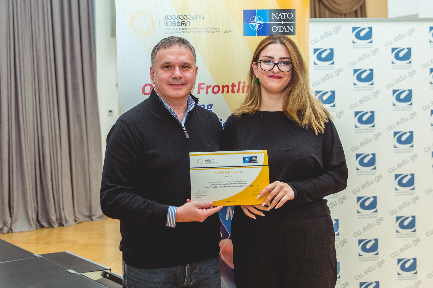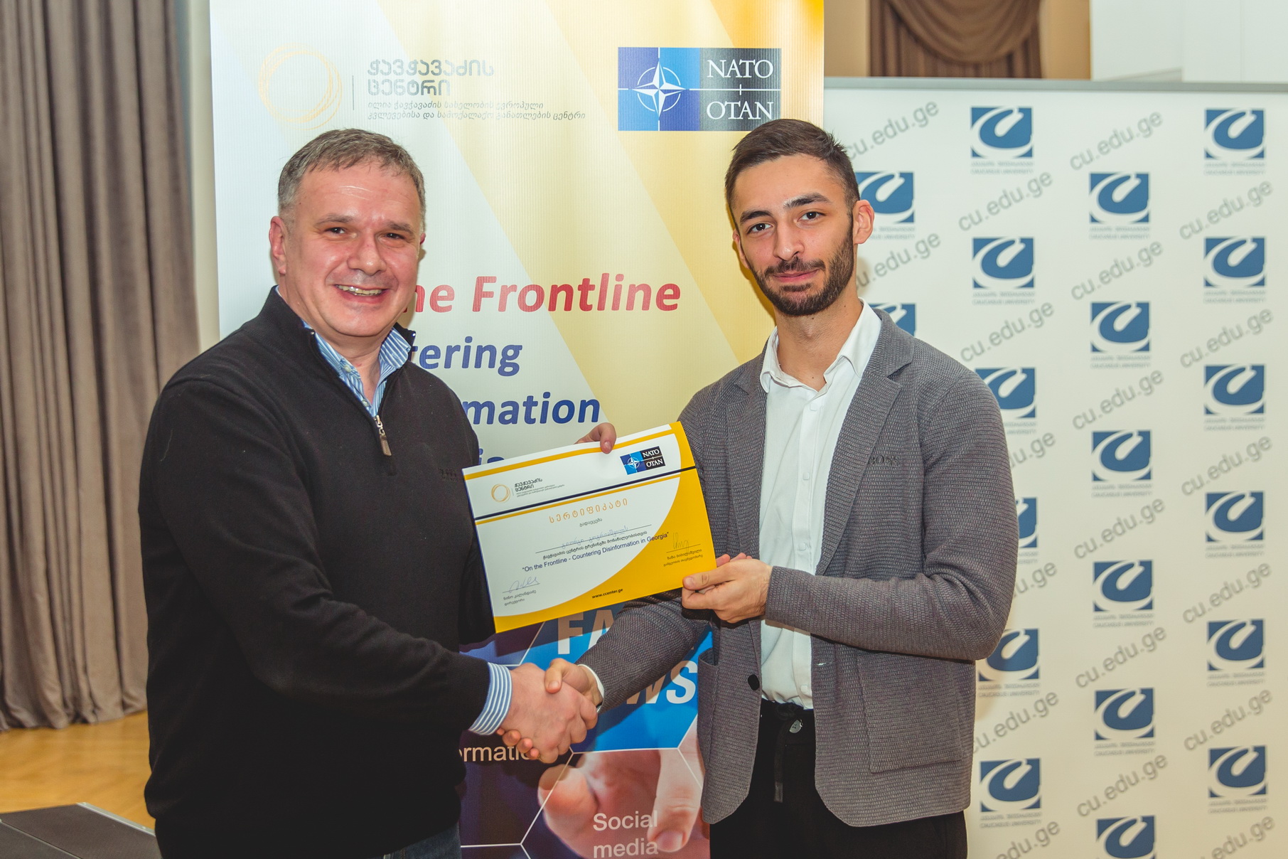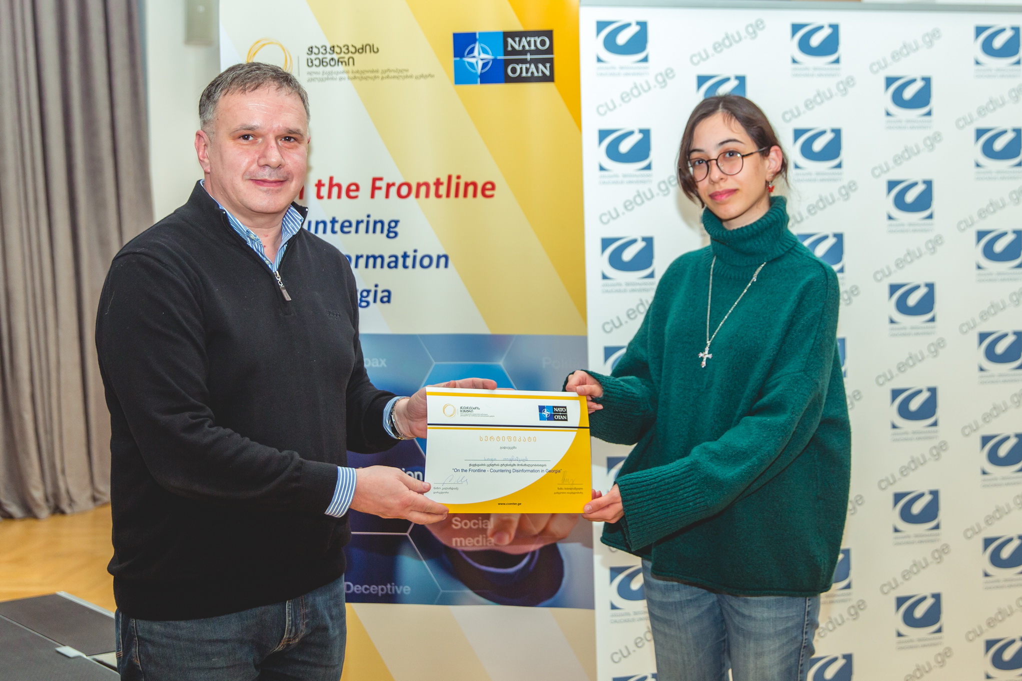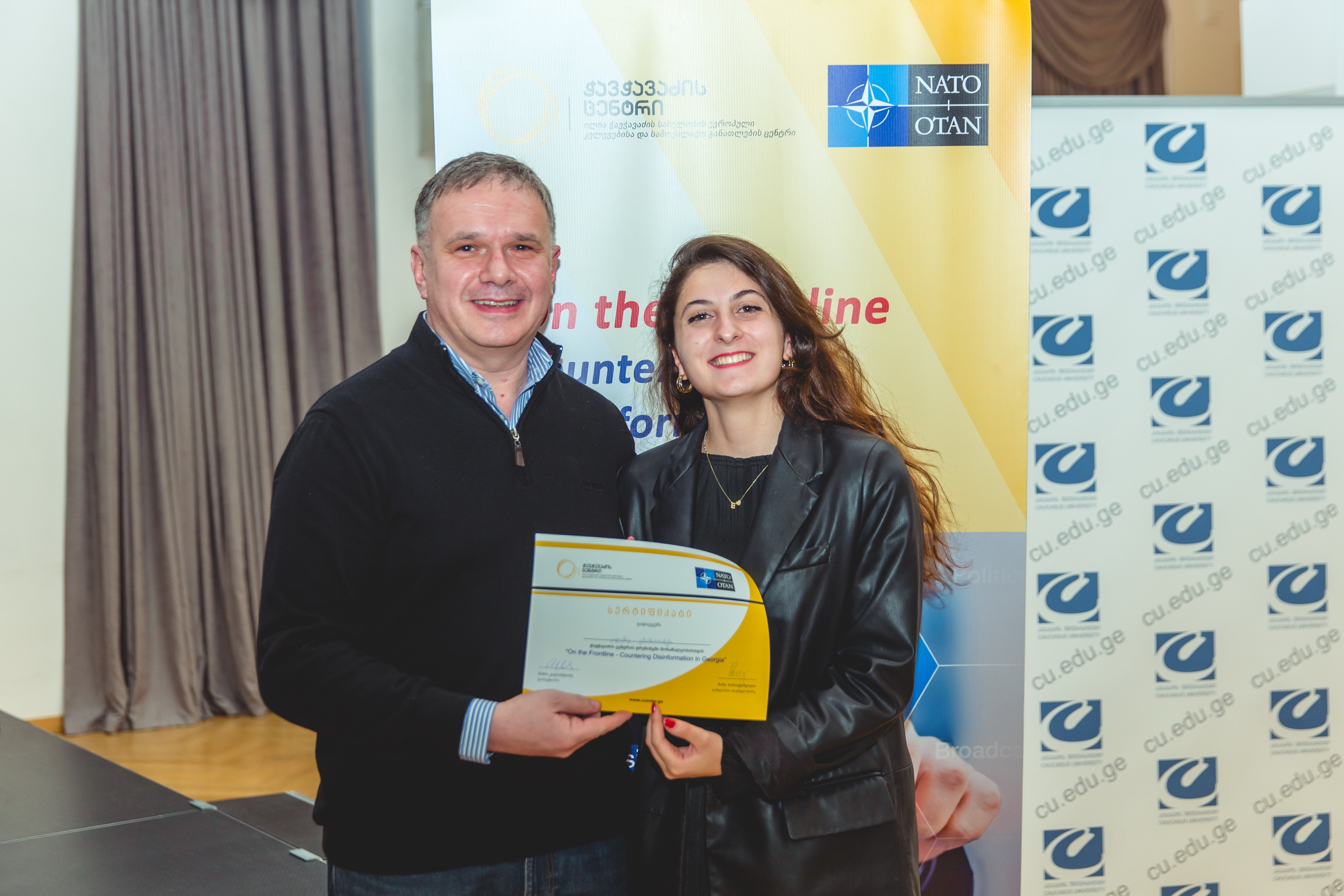 და NATO-ს სახალხო დიპლომატიის განყოფილების მხარდაჭერით, კავკასიის უნივერსიტეტი - Caucasus University-ში გაიმართა ჭავჭავაძის ცენტრის პროექტის „წინა ხაზზე - დავამარცხოთ დეზინფორმაცია საქართველოში“ შემაჯამებელი ღონისძიება. პროექტი სამ ეტაპად განხორციელდა და მასში სხვადასხვა ასაკის 80-მდე ადამიანმა მიიღო მონაწილეობა. ტრენინგებისას ცენტრის მკვლევარები და მოწვეული ექსპერტები მონაწილეებს ესაუბრნენ დეზინფორმაციის ამოცნობასა და მასთან ეფექტიანი ბრძოლის მეთოდებზე. მონაწილეებს გადაეცათ ცენტრის მიერ საგანგებოდ ამ პროექტისთვის გამოცემული პროპაგანდასთან ბრძოლის პრაქტიკული გზამკვლევი.