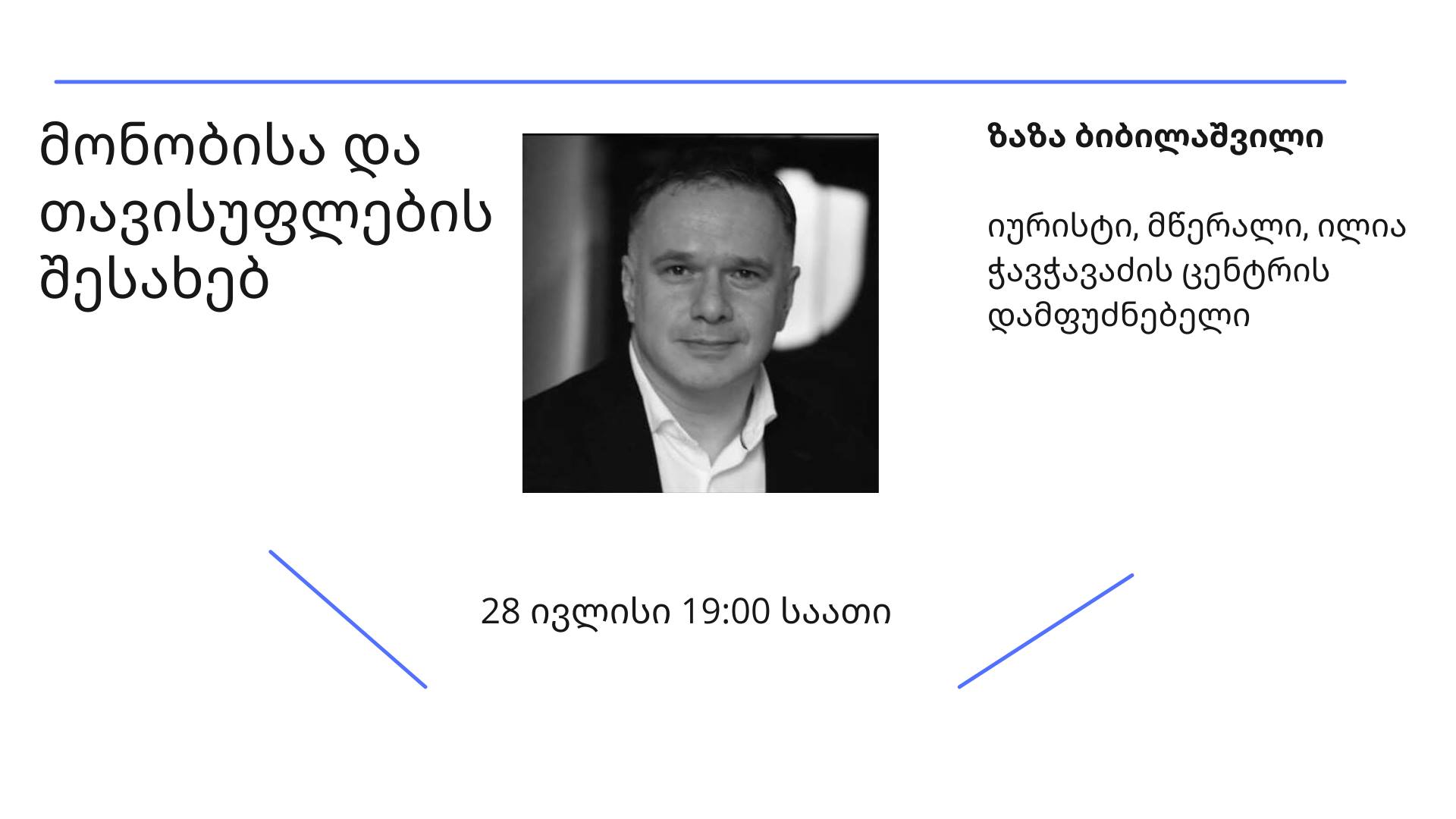 ლექციების ციკლის ფარგლებში "მონობისა და თავისუფლების შესახებ", 28 ივლისს, გაიმართა ილია ჭავჭავაძის ცენტრის დამფუძნებელს ზაზა ბიბილაშვილს საჯარო ლექცია.